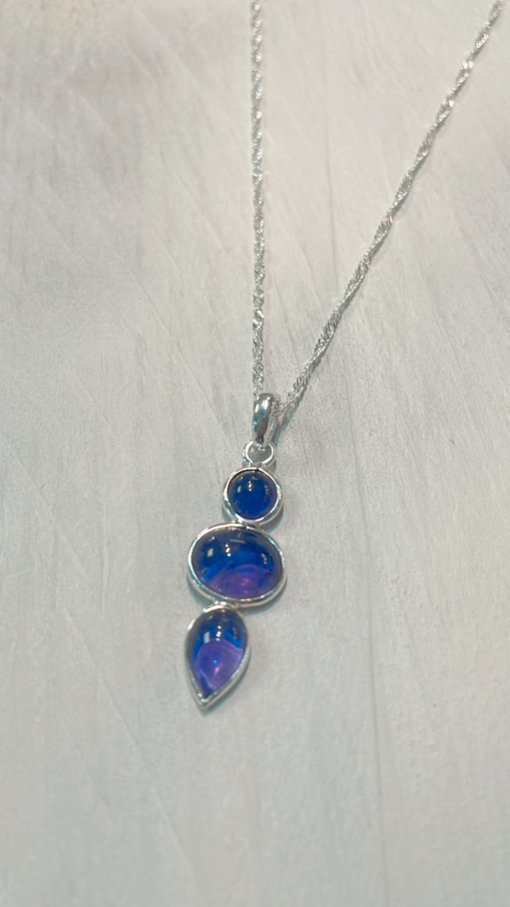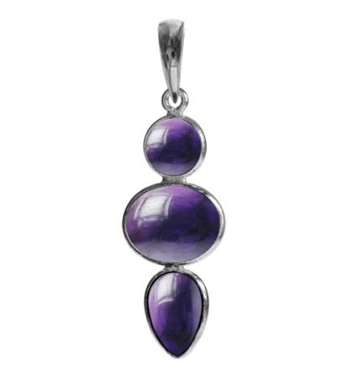 This beautiful pendant features three cabochon amethyst stones in round, oval & teardrop shapes set one below the other. The pendant is made from 925 sterling silver and hangs from an 18inch sterling silver chain.