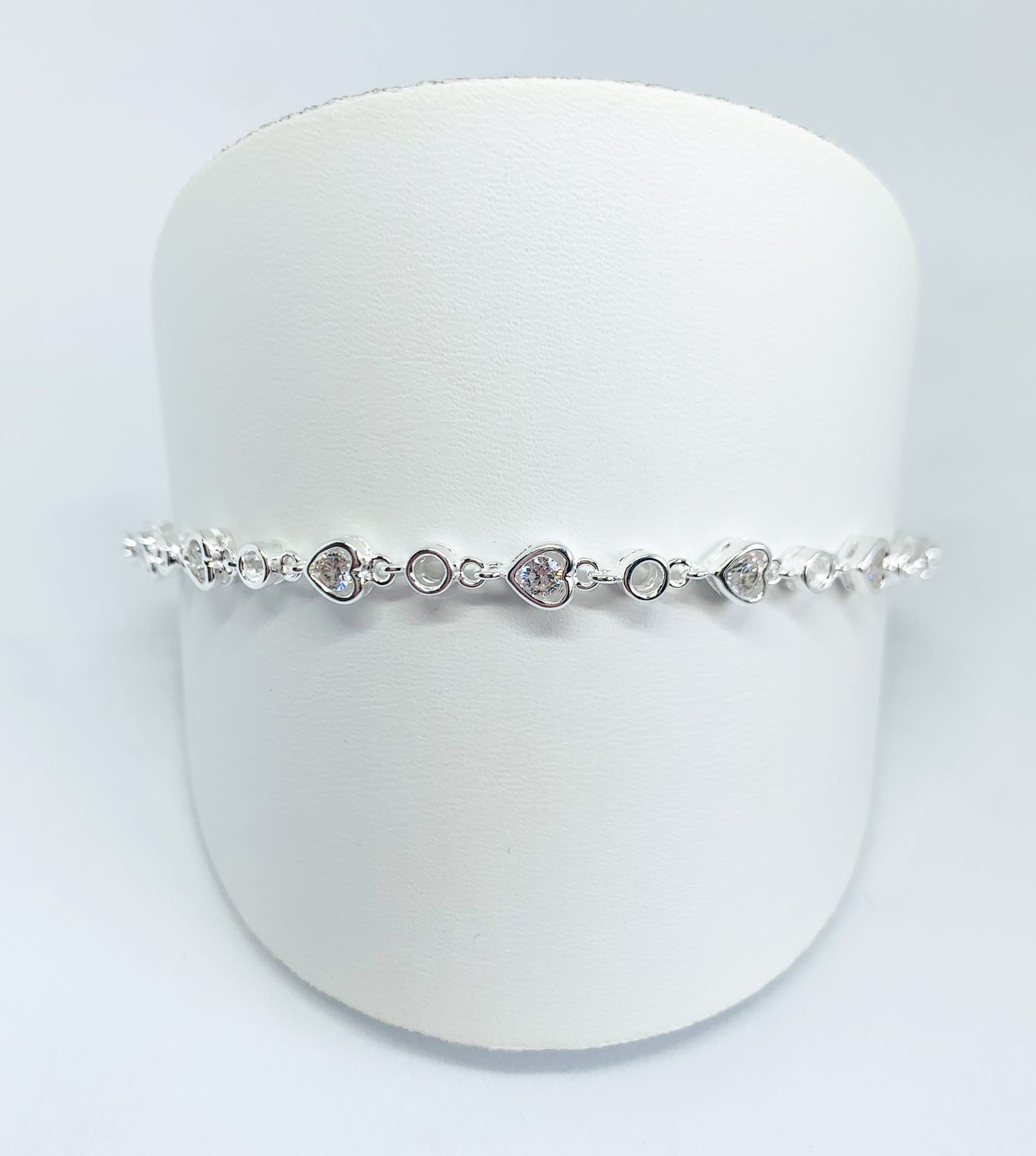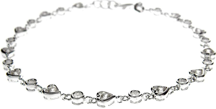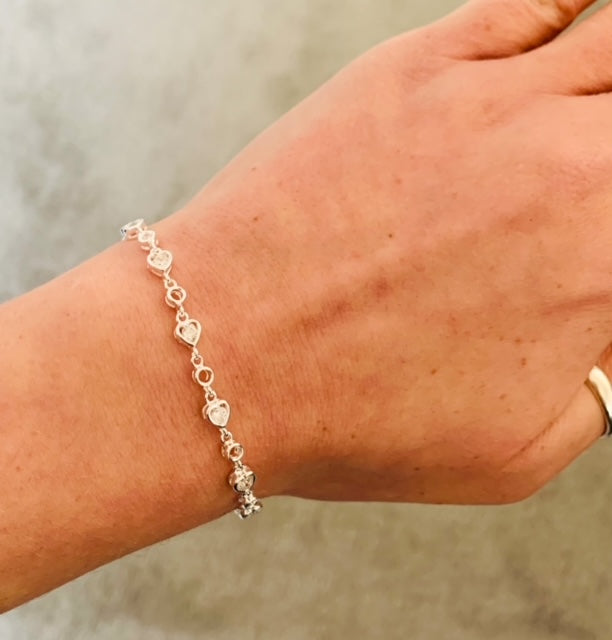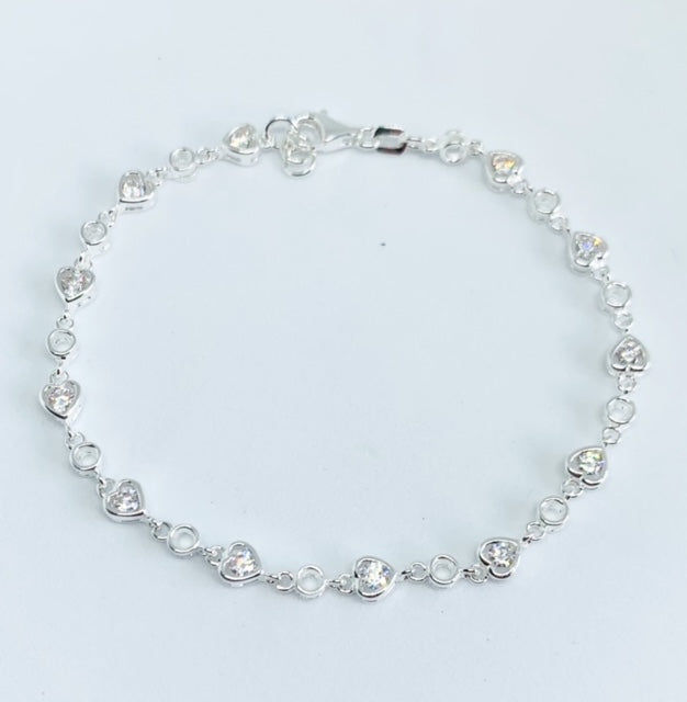 This stunning 925 sterling silver bracelet features alternate open circle &  heart shaped cubic zirconia dazzling crystals that are set in a silver surround and linked together to 18.5cm long with a half cm extension chain.