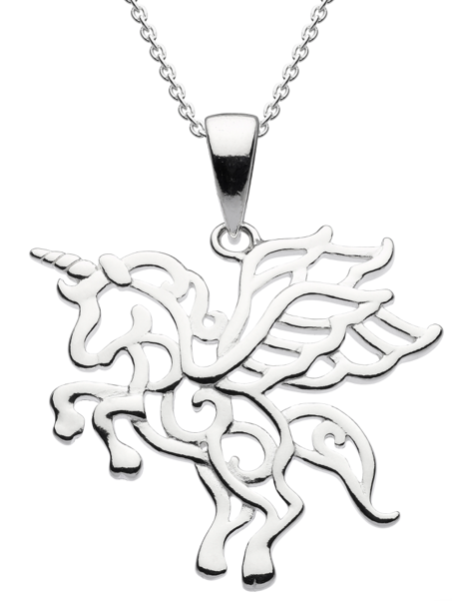 As the saying goes… always be yourself, unless you can be a unicorn! This sterling silver flying unicorn pendant is cut out in a filigree design.