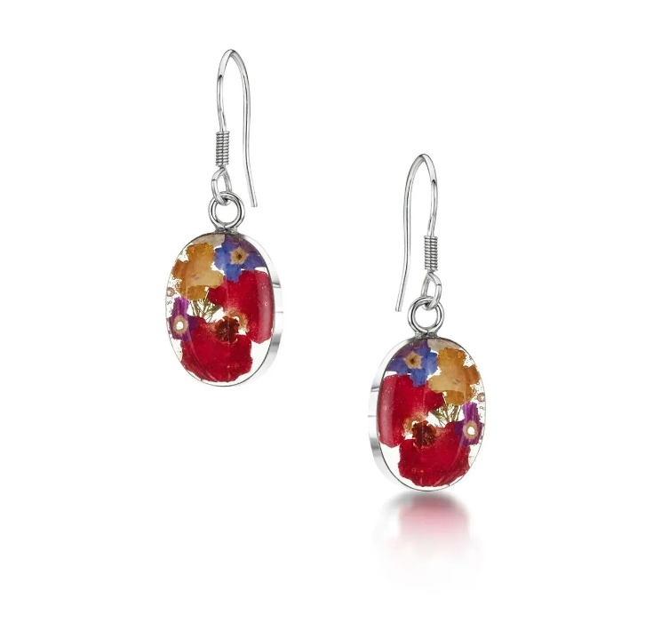 These exquisite oval drop earrings showcase vibrant Euphorbia Milii flowers—tiny blossoms often mistaken for poppies, but with their own unique charm—captured in resin and preserved forever.