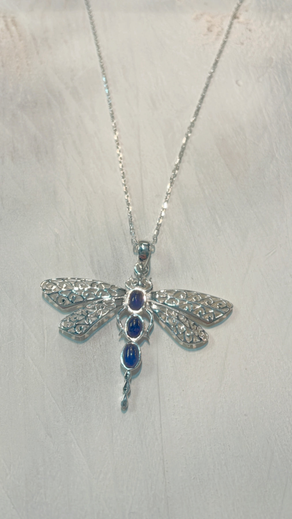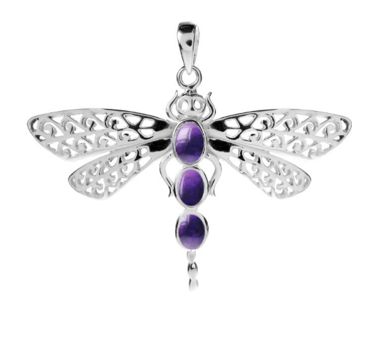 This beautiful & unique pendant features a large dragonfly with intricately patterned wings and three oval shaped cabochon amethyst stones set into the body. The pendant is made from 925 sterling silver and hangs from an 18inch sterling silver chain.