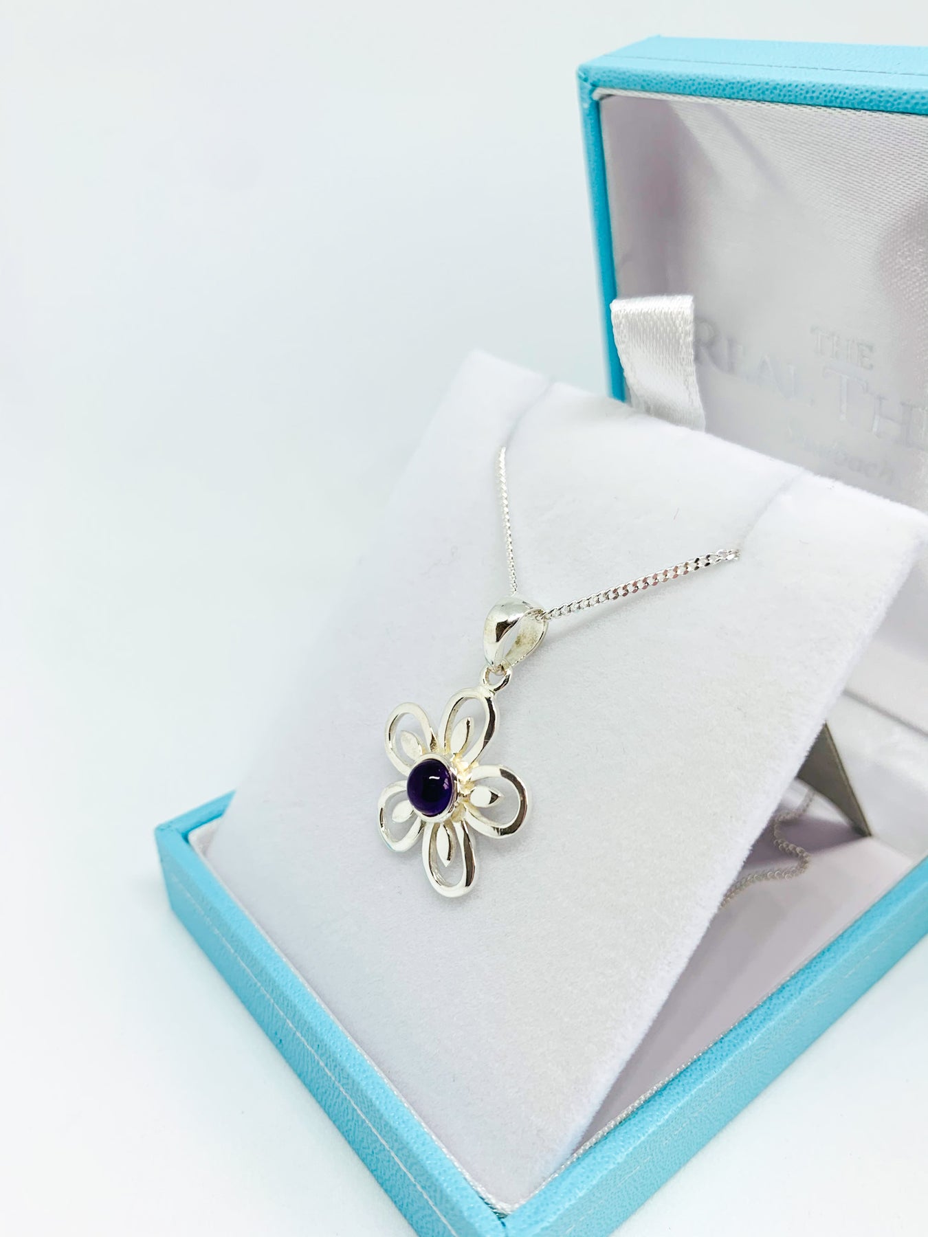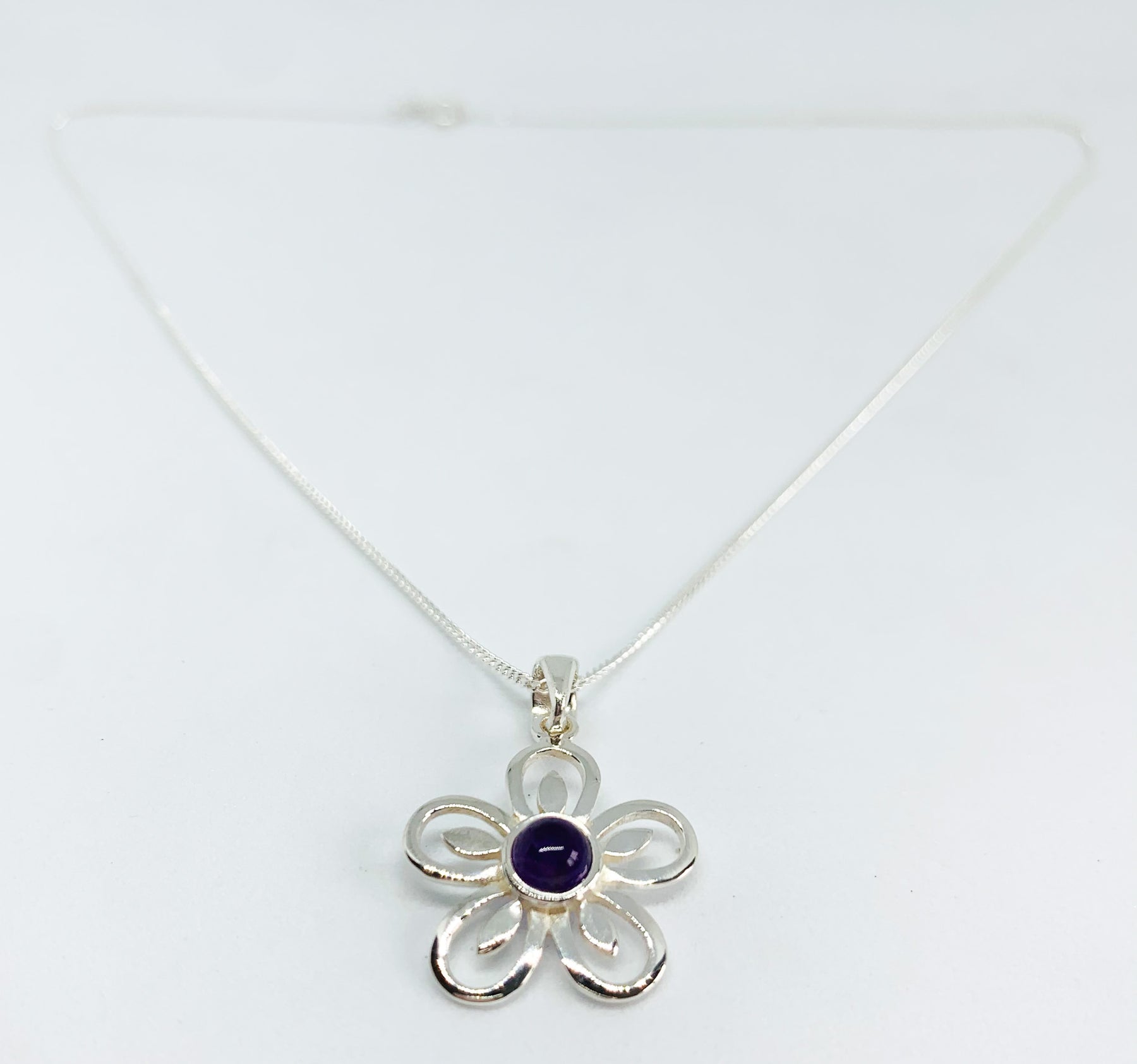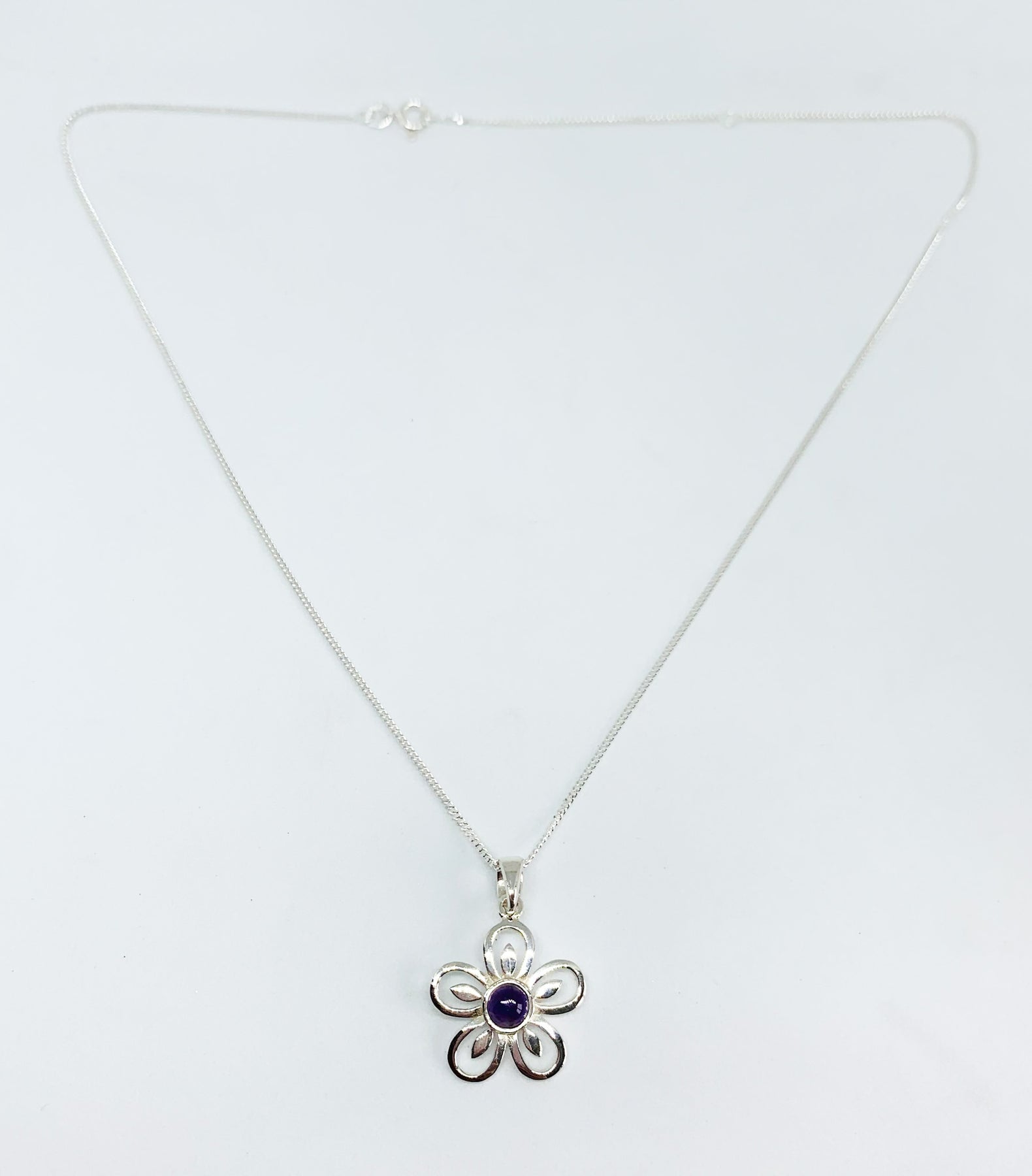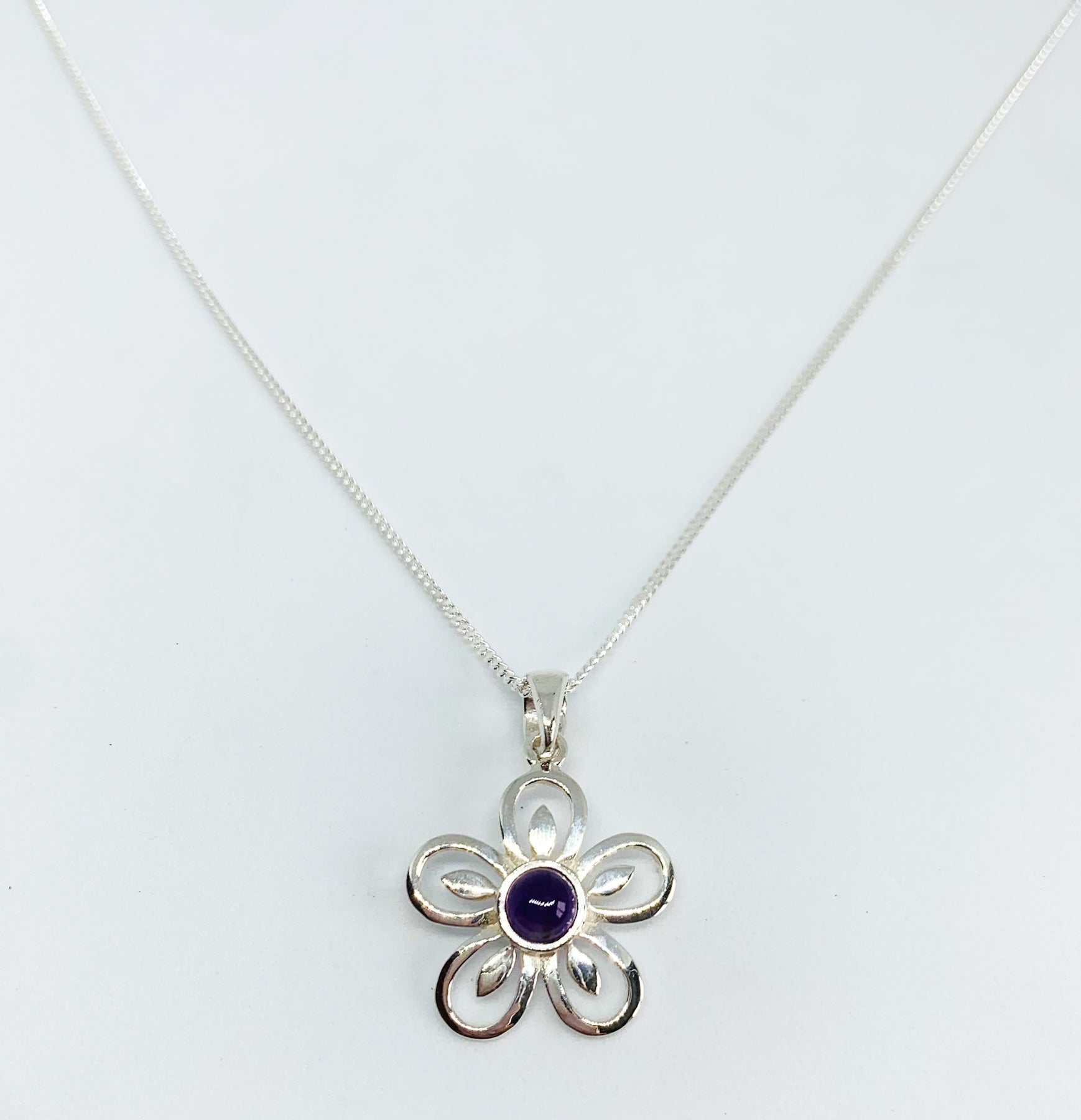 This stunning Amethyst pendant is the perfect addition to any outfit. Made from 925 sterling silver in a cut out open flower design with a small round shaped amethyst stone centre.