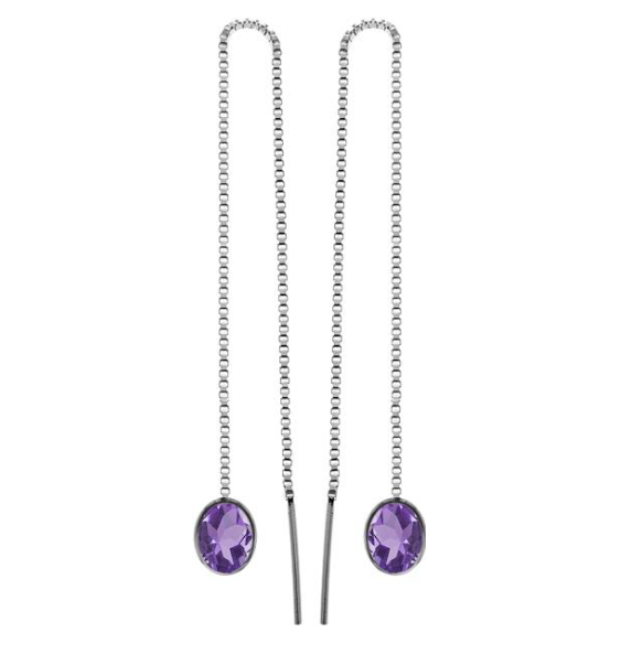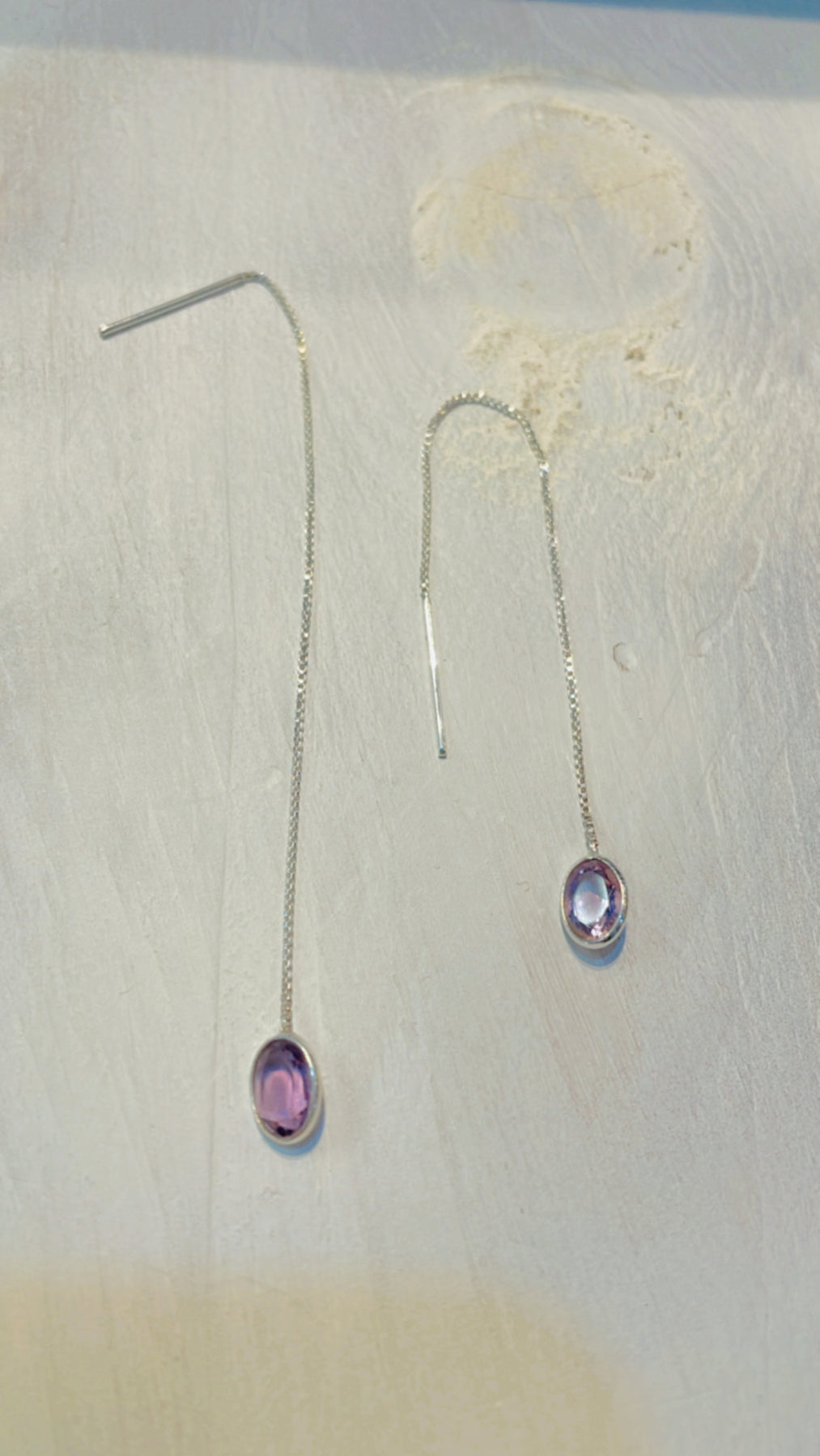 These long drop earrings feature oval cut Amethyst stones, faceted so that they catch the light at every angle. The gemstones are in a rub-over silver setting at the end of a 8cm silver chain. These earrings are made to pull through the piercing and can be worn at any desired length.
