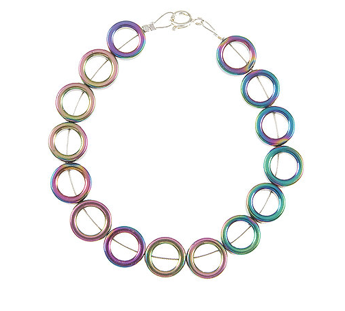 This magical piece has a mesmerising rainbow lustre shining on every unique bead. Spectrum uses solid haematite rings which are cool to the touch and incredibly eye-catching. They glisten, creating a bold and exotic appearance.