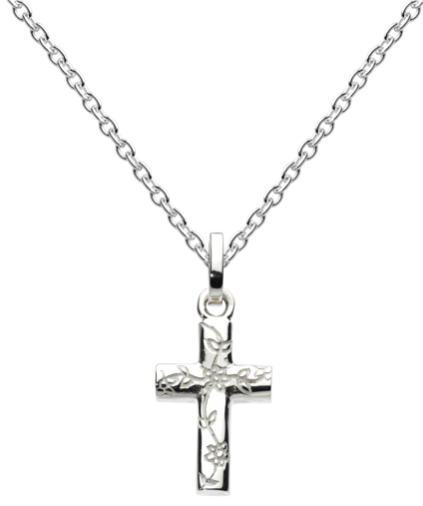 Attractive solid sterling silver cross pendant with intricate flower engraving.