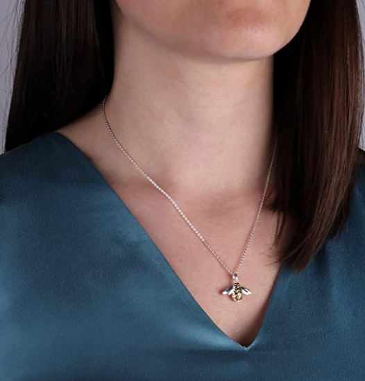 Bee happy! It's hard not to be when you look at this stylish and charming bumblebee necklace in a mix of sterling silver and 18ct gold plate. Decorated with an intricate pattern of fauna and flora, this is a very distinctive design. This enchanted design is woodland inspired, rich with texture.