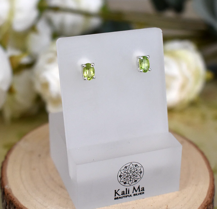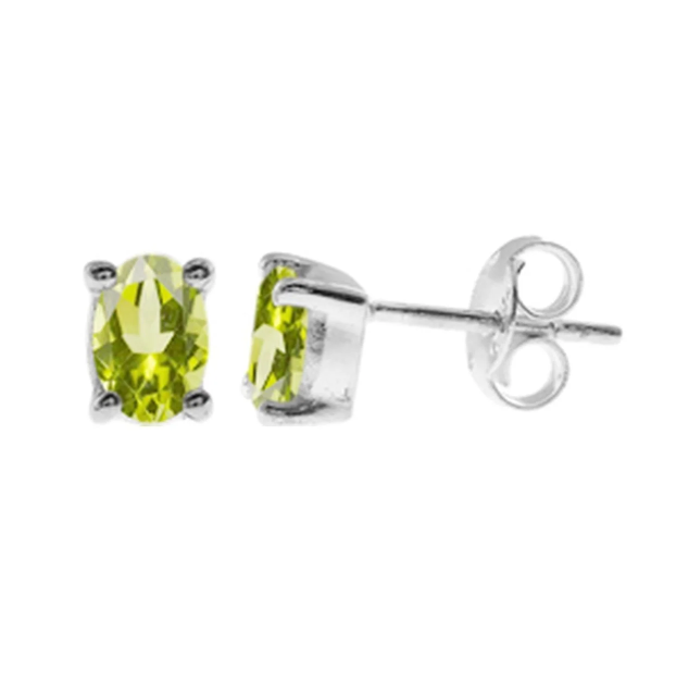 These stunning stud earrings are set with oval shaped, transparent, light green peridot stones that are 6x4mm big in a sterling silver claw setting with post and butterfly backs.