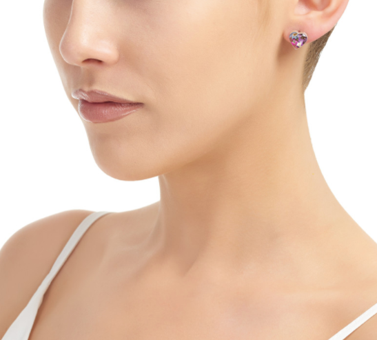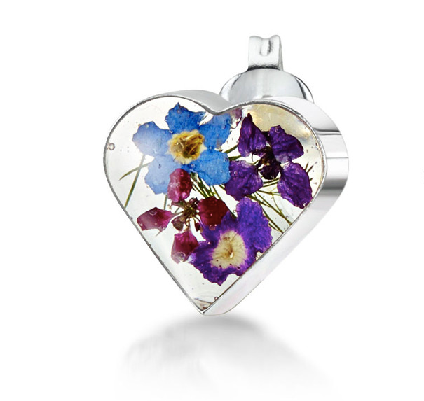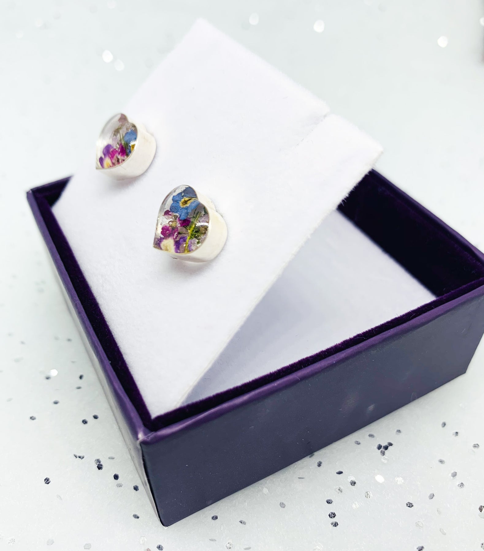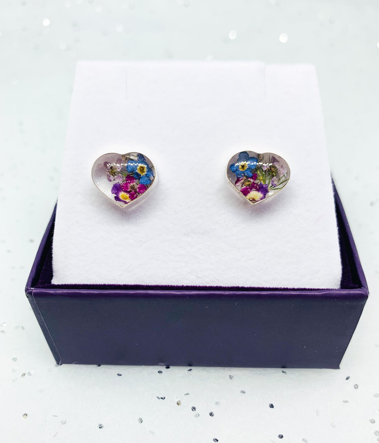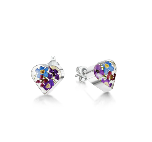 Sterling Silver stud earrings handmade with real flowers by Shrieking Violet - Hearts - Purple haze collection - Includes stylish gift box. Size (aprox.) 10mm x 10mm