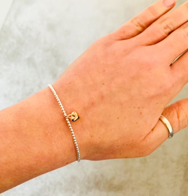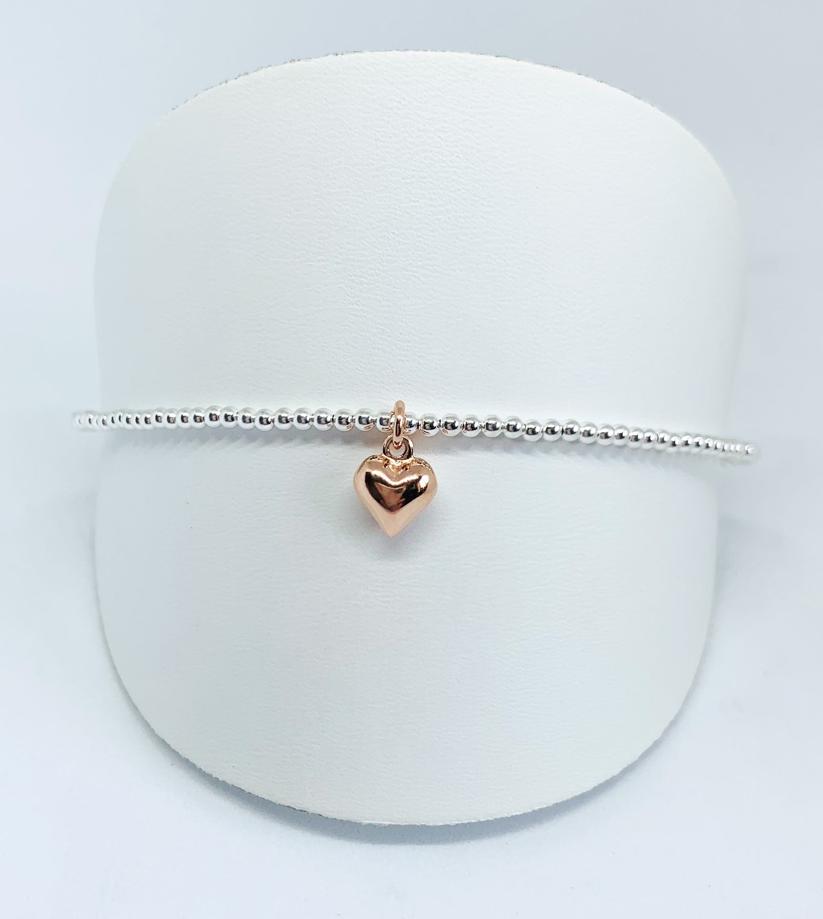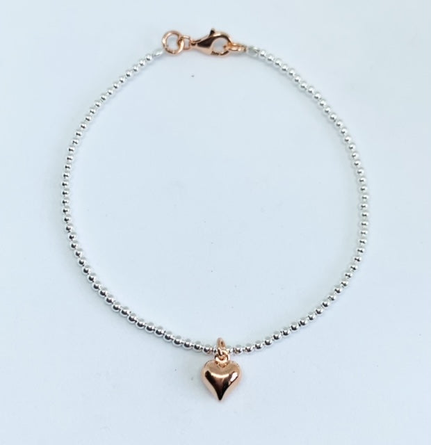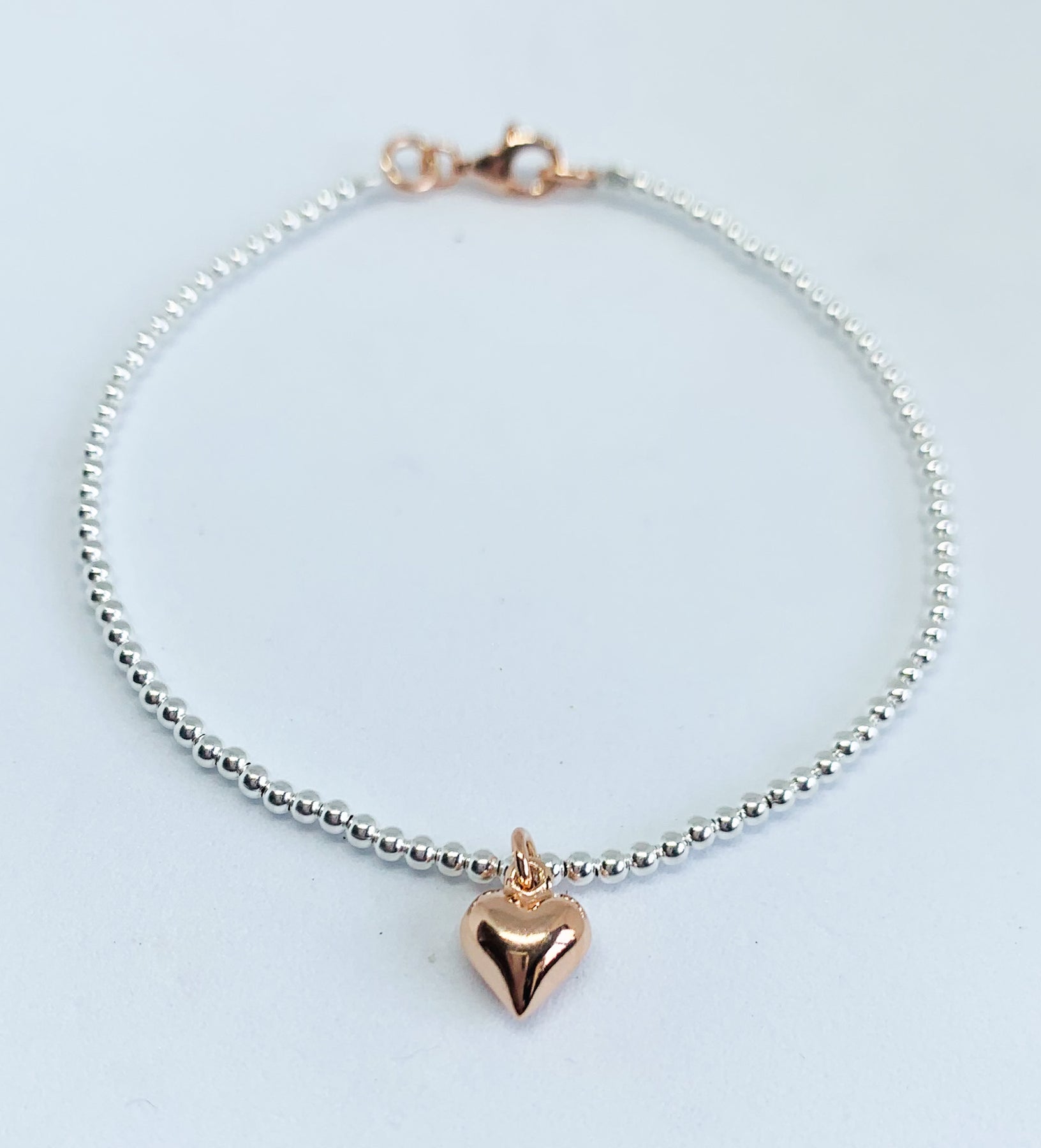Perfect for layering alongside your favourite watch or bracelets, this pretty 925 Sterling silver dainty ball bead bracelet features a rose gold vermeil 3d puff heart charm & is a versatile addition to any jewellery box.