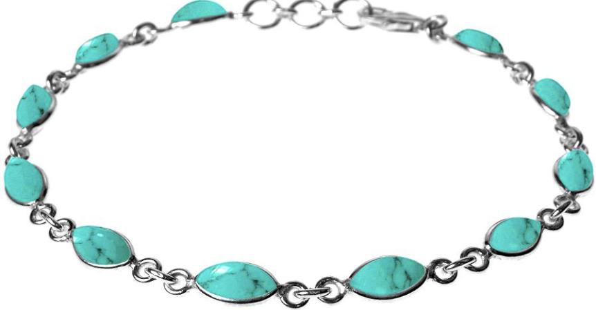 This stunning Turquoise stone bracelet is the perfect addition to any outfit. Made from 925 sterling silver with dreamy marquis shaped turquoise stones set in a silver surround linked together to 19cm long with a 1.5cm extension chain.