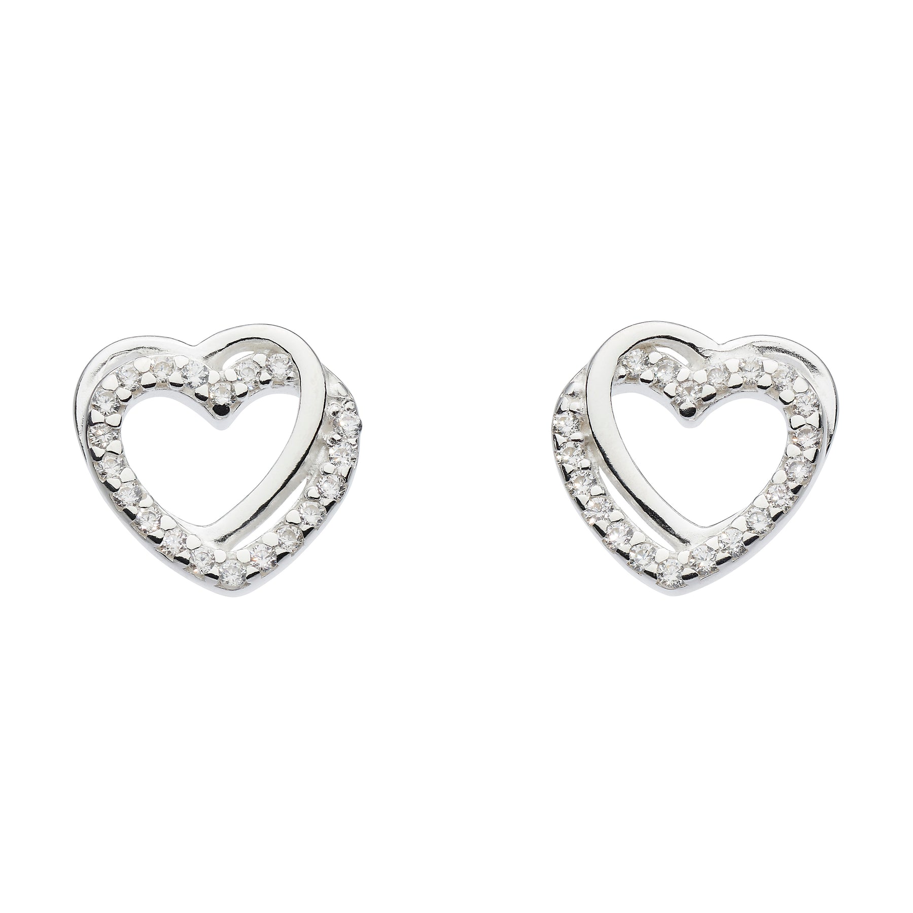 Two hearts entwined. A simplistic sterling silver heart looped with a sparkling heart of cubic zirconia stones form these loving stud earrings.