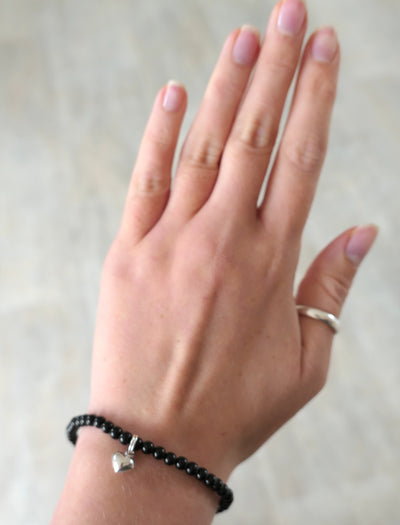 A beautiful bracelet made with 4mm round polished black onyx beads on a no-faff elastic that simply stretches over the wrist. This bracelet is finished with a small 925 sterling silver 3D puff heart charm that elegantly hangs from the beads. Stack this bracelet with your other favourites or wear alone.