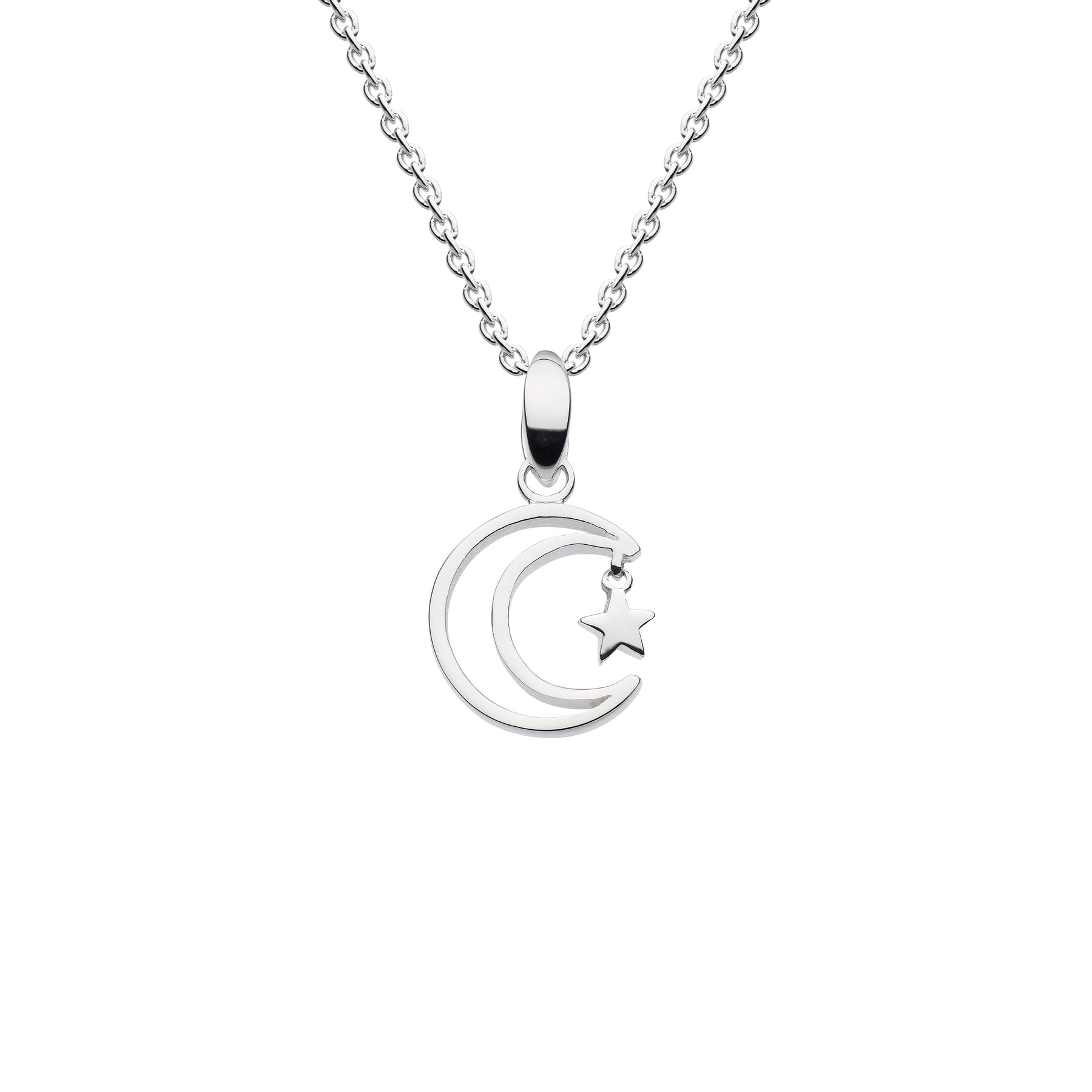A bang on trend celestial themed necklace made from 925 sterling silver on an 18inch silver chain. The pendant features an outline of a moon crescent with a dinky solid star hanging from the top of the moon. Why not pair up with some moon & star stud earrings also from the Dew range.