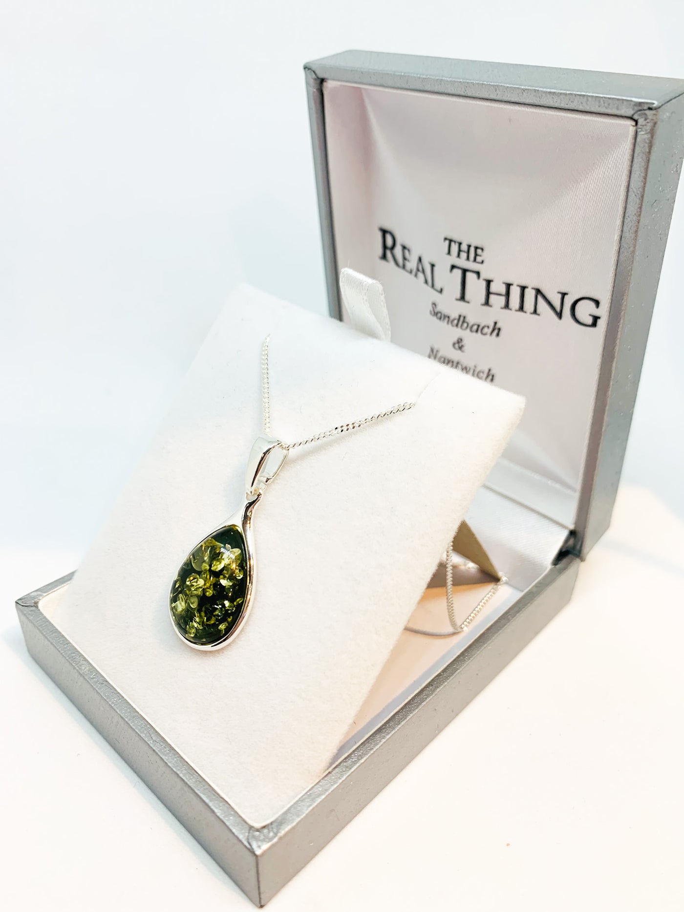 Made from 925 sterling silver this beautifully timeless, pear shaped real green amber resin sits in the centre of a smooth silver surround & hangs from an 18inch silver chain.