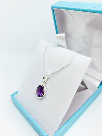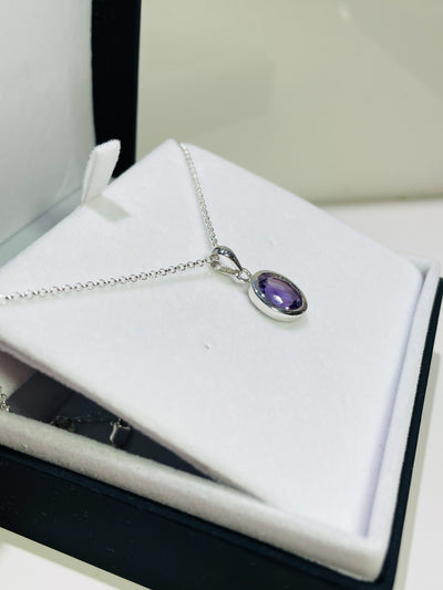 This pendant features an oval cut Amethyst stone, faceted so that it catches the light at every angle. This gemstone is set in a heavy and deep 925 sterling silver surround & hangs on an 18inch silver chain.