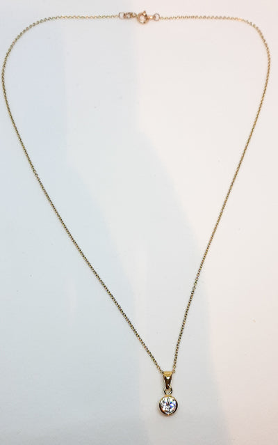 Yellow gold-plated on 925 sterling silver dainty round cubic zirconia stone in a rub-over setting. 18inch yellow gold chain is included.