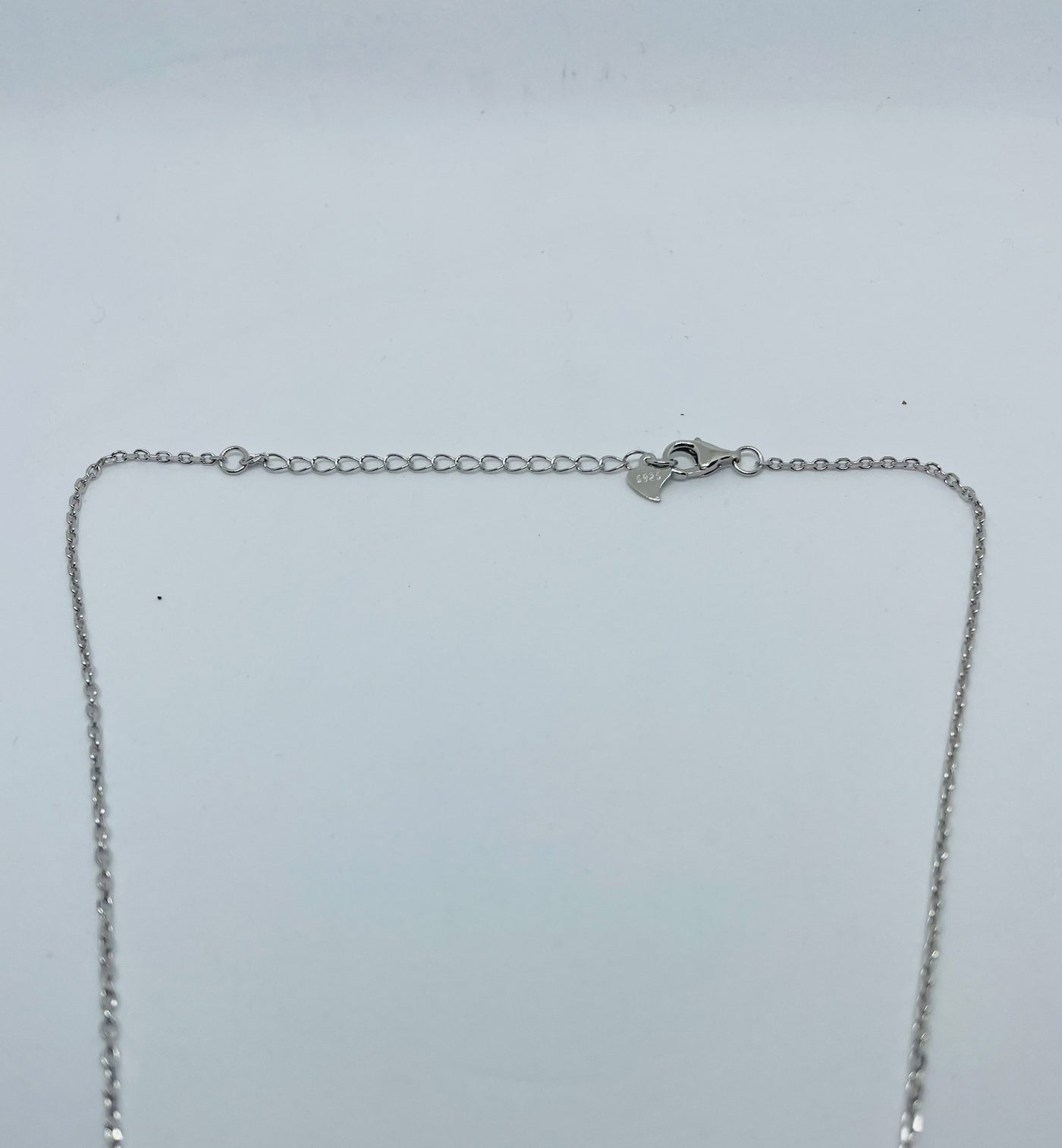 Made from rhodium plated (anti-tarnish & hypo-allergenic) 925 sterling silver this beautiful necklace features a popular 4 leaf flower shape made from white Mother of Pearl in the centre of an adjustable 16-18inch sparkly trace chain.